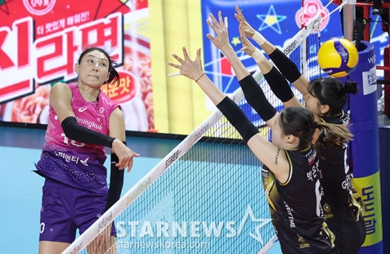 흥국생명 김연경이 정관장 더블 블로킹 위로 강스파이크를 날리고 있다.