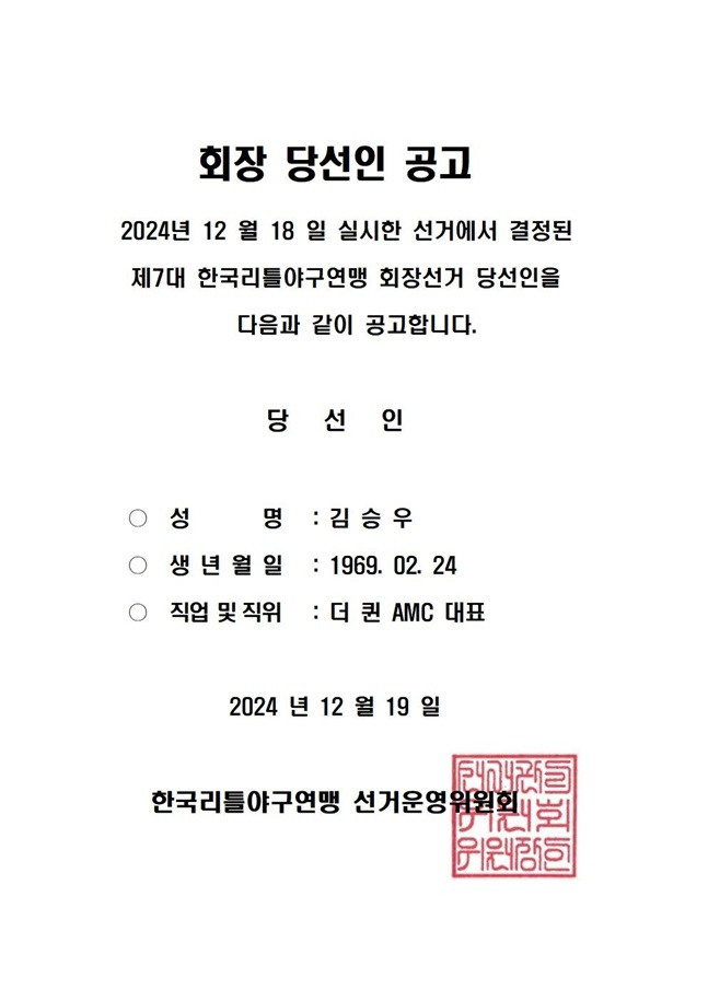 한국리틀야구연맹은 "12월 18일 실시한 선거에서 결정된 제7대 한국리틀야구연맹 회장선거 당선인을 공고한다"며 김승우의 당선 사실을 밝혔다. 김 후보는 현 수장인 유승안 회장을 꺾고 향후 4년 동안 연맹을 이끌게 됐다.