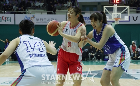 일본 W리그 키호가 WKBL 나가타 모에(오른쪽) 수비에 막히자 패스할 곳을 찾고 있다.