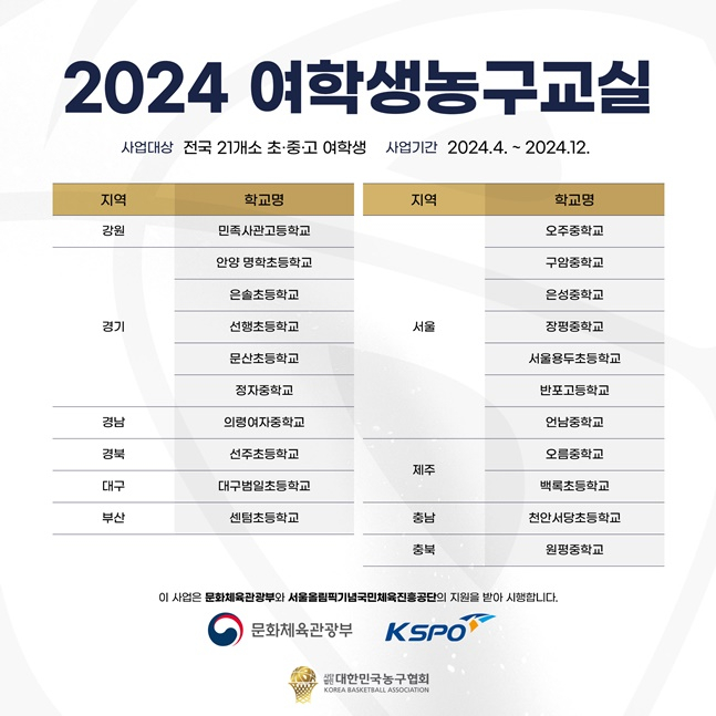 대한체육회가 주최하고 문화체육관광부와 서울올림픽기념국민체육진흥공단이 재정 후원한 이번 사업은 스포츠 활동에 소외된 전국 초·중·고 여학생들에게 농구를 통한 신체 활동 기회를 제공하고자 진행됐다. 이를 통해 농구의 기초를 배우고, 체육 활동에 대한 흥미를 유발해 건강한 운동 습관을 형성할 수 있었다고 협회는 전했다.