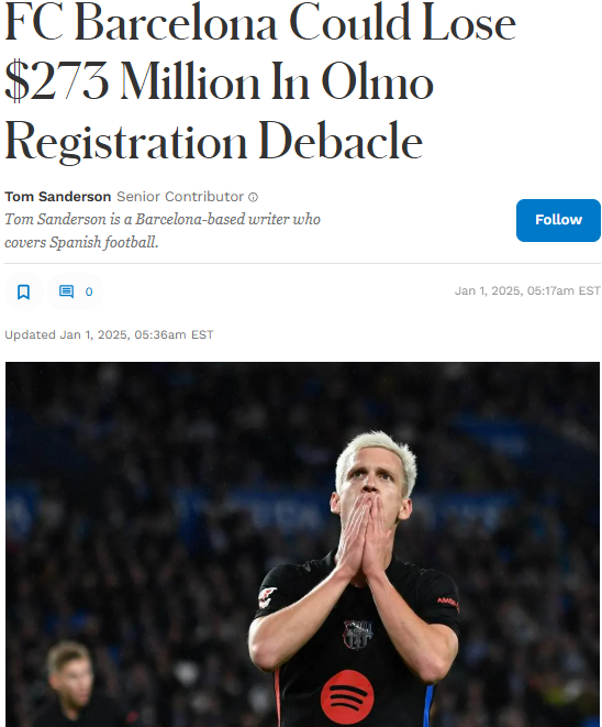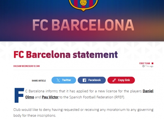 '가디언'은 "바르셀로나는 선수 연봉 상한 규정을 무시한 채 영입을 단행했다"며 "전반기에는 주축 선수들이 부상으로 결장했다. 라리가 규정에 따라 바르셀로나는 해당 선수들의 임금 80%만 지급했다. 올모와 빅토르의 선수 등록을 마칠 수 있었던 이유"라고 설명했다.
