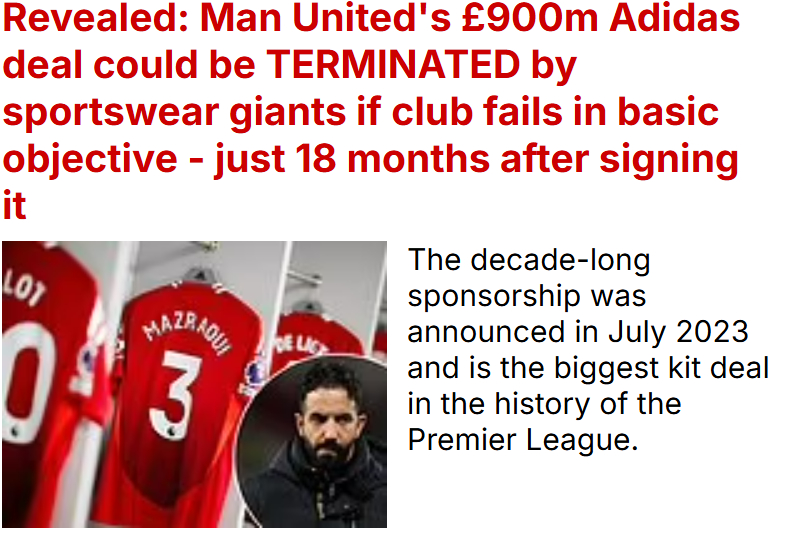 영국 매체 '데일리 메일'은 2일(한국시간) "맨유와 아디다스는 9억 파운드(약 1조 6400억 원) 규모의 계약을 맺었다"며 "만약 맨유가 기본 목표치에 도달하지 못하면, 아디다스는 18개월 만에 계약을 종료할 수 있다. 맨유는 최대 규모의 스폰서십을 잃을 위기에 처했다"고 보도했다.