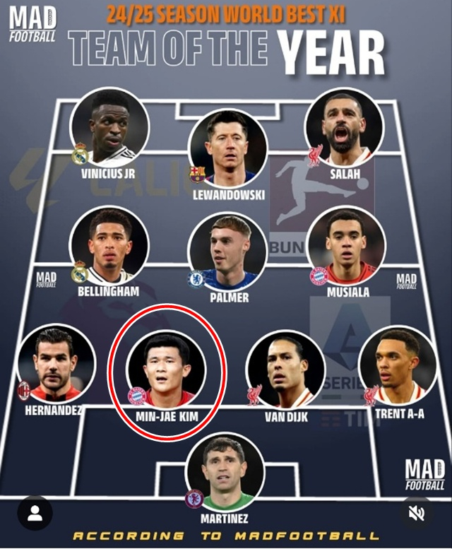 축구전문 매드 풋볼은 2일(한국시간) 올 시즌 최고의 활약을 보여준 선수들로 월드 베스트11을 구성했다. 대한민국 센터백 김민재도 당당히 이름을 올렸다. 김민재는 잉글랜드 프리미어리그(EPL) 리버풀에서 뛰고 있는 '월드클래스' 버질 반 다이크와 센터백 호흡을 맞췄다. 뮌헨 선수로는 김민재, 자말 무시알라 둘 뿐이었다.