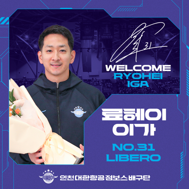 대한항공은 3일 "아시아 쿼터 외국인 선수인 아레프 모라디(27·등록명 아레프)를 대신해 프랑스리그 AS 칸에서 활약하고 있는 일본 출신 리베로 이가 료헤이(31·등록명 료헤이)를 교체 영입했다"고 공식 발표했다.
