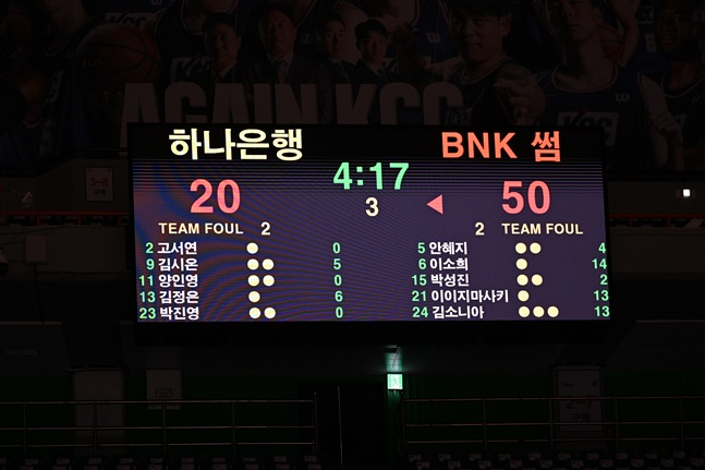 3쿼터 들어서도 BNK는 좋은 흐름을 이어갔고, 이에 체력 안배를 위해 심수현, 김민아 등 백업 자원들이 일찌감치 투입됐다. 4쿼터 초반까지 20점대 득점에 묶여있던 하나은행은 막판 점수를 올렸지만 너무 늦은 타이밍이었다.