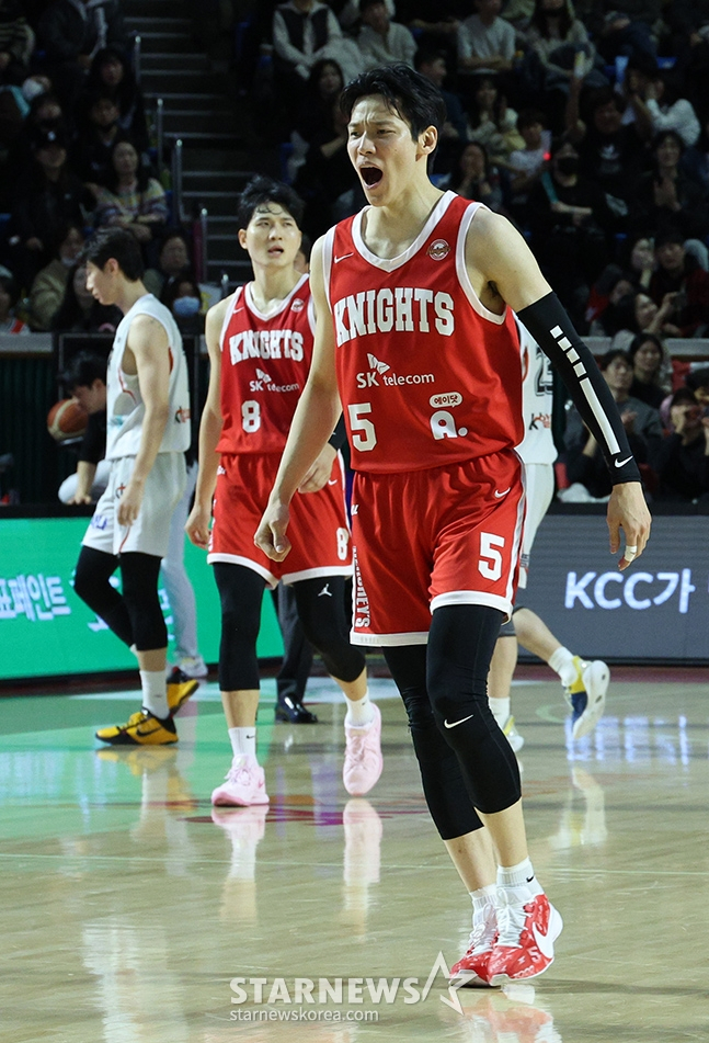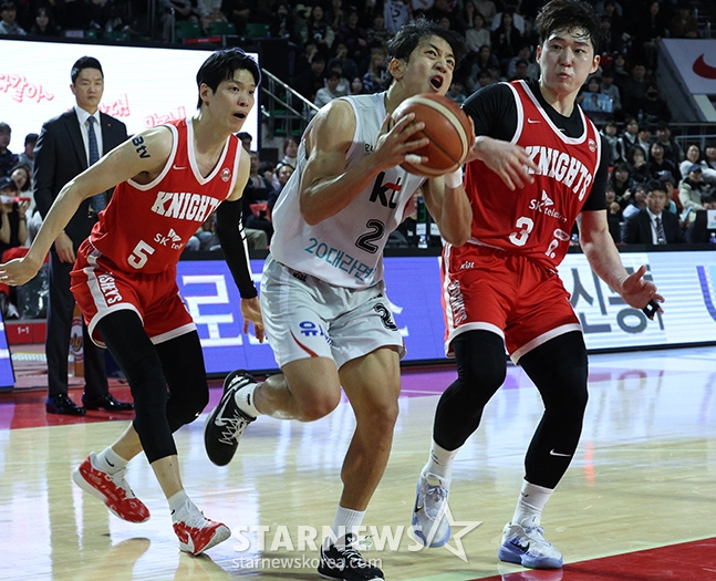 SK는 지난 5일 잠실학생체육관에서 열린 '2024~2025시즌 KCC 프로농구 정규리그' 3라운드 홈경기에서 수원 KT를 67-63으로 꺾었다. 4연승을 이어간 SK는 19승6패로 선두를 질주했다.