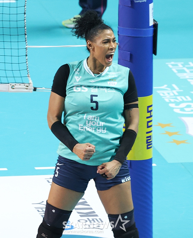 GS칼텍스 실바가 결정적인 공격을 성공시킨 후 포효하고 있다.