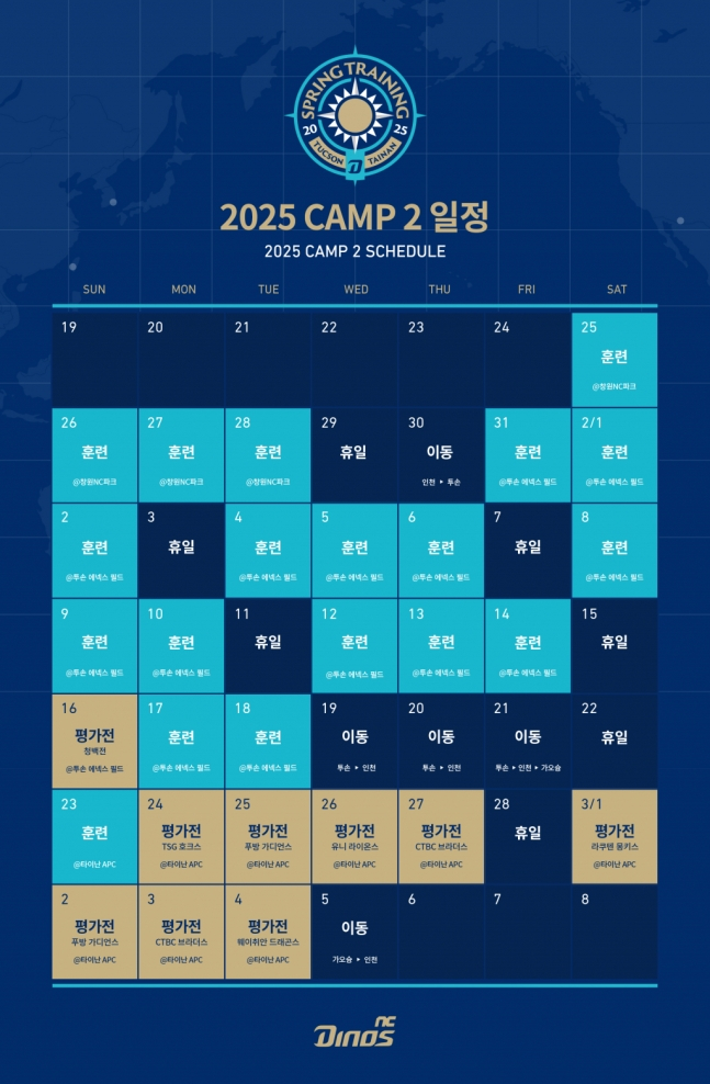 NC는 10일 "오는 25일부터 창원 NC파크에서 CAMP 2(NC 스프링캠프) 일정을 시작한다. 이어 30일 출국, 미국 투손과 대만 타이난 등 해외에서 일정을 소화할 예정이다"고 밝혔다.