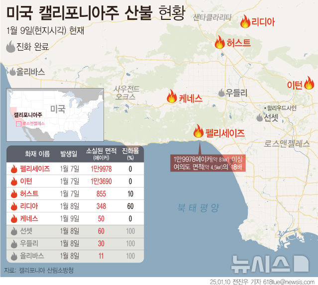 지난 7일 발화한 것으로 알려진 LA 산불은 닷새째 이어지고 있다. 뉴시스 보도에 따르면 가장 큰 규모인 팰리세이즈 산불은 10일 오후 1시(현지시간) 기준 약 2만330ac(약 82.2㎢)에 이르는 면적을 태웠다고 한다. 진화율도 8%에 그치고 있다. 이미 전체 기준 여의도 크기의 40배가 넘는 면적을 태웠다.