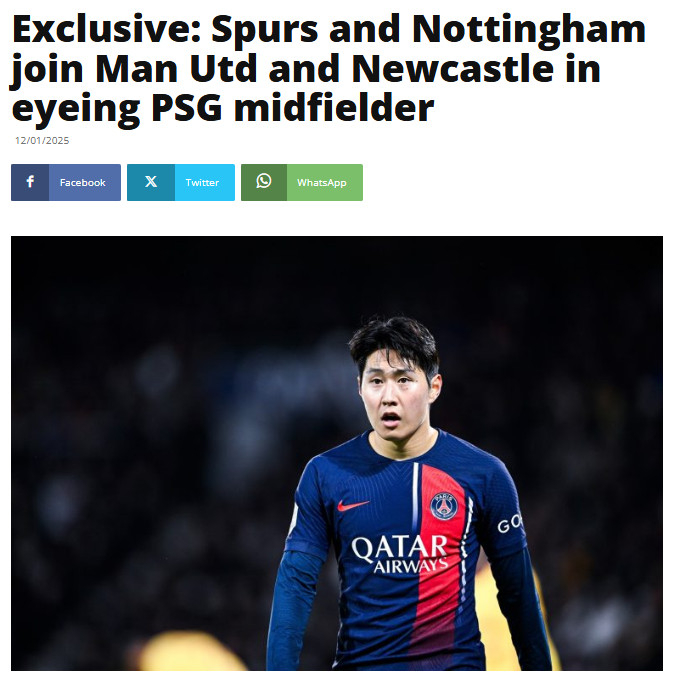 축구 전문 '온더미닛'은 13일(한국시간) 이강인의 토트넘 이적설을 독점 보도했다. 매체는 "토트넘이 이강인을 노리고 있다"고 전했다. 매체에 따르면 이강인을 노리는 팀은 토트넘 외에도 맨체스터 유나이티드, 뉴캐슬, 노팅엄 포레스트도 있다.