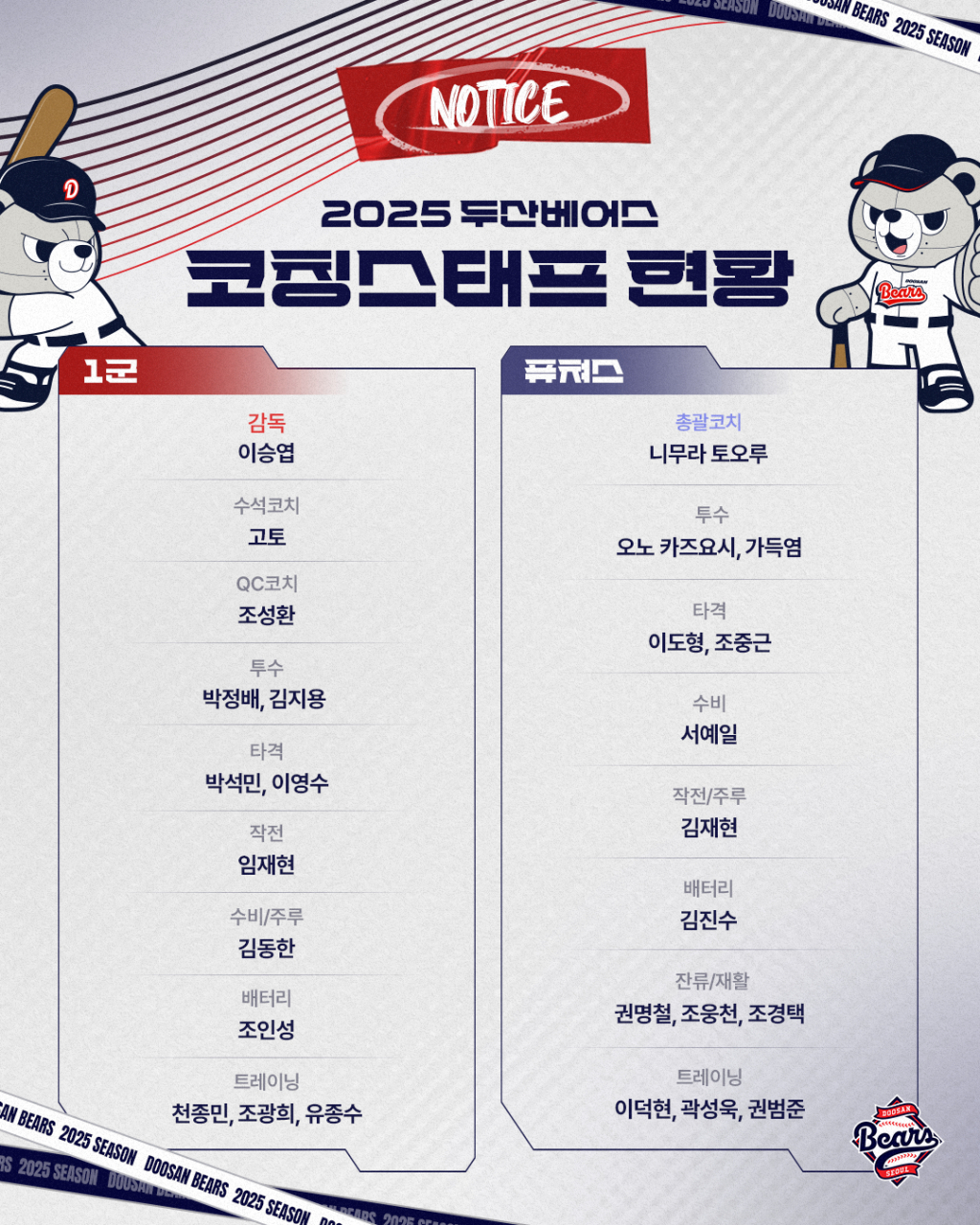 두산 베어스의 2025시즌 코칭스태프 보직이 공개됐다.