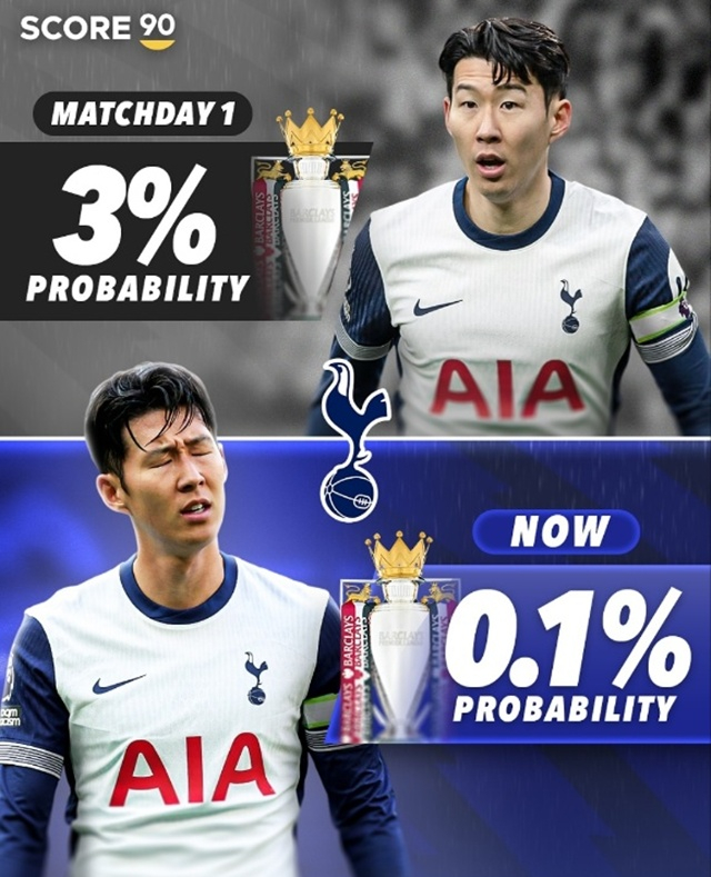 축구전문 스코어90은 15일(한국시간) 잉글랜드 프리미어리그 주요 팀들의 우승 확률을 공개했다. 리그 1라운드 당시 우승 확률과 현재 우승확률이 어떻게 변했는지를 비교했다. 대부분 팀들의 우승확률이 떨어진 가운데, 토트넘, 맨유는 처참한 우승확률을 받았다. 토트넘의 경우 1라운드에서 우승 확률 3%를 받았는데, 지금은 0.1%로 떨어졌다. 맨유도 4%에서 0.1%로 급락했다.