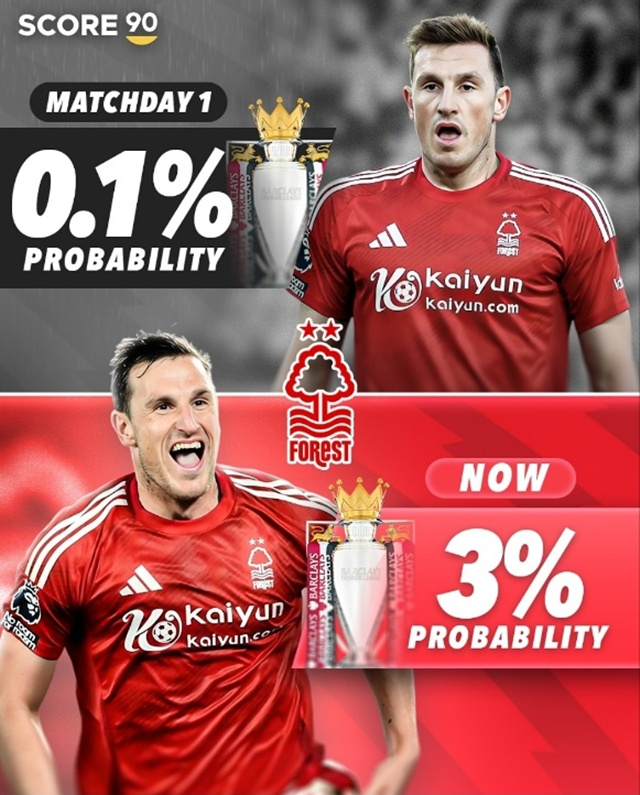 반면 깜짝 우승후보가 등장했다. 바로 '돌풍의 팀' 노팅엄 포레스트다. 1라운드 당시 우승확률 0.1%에서 3%로 뛰어올랐다. 올 시즌 노팅엄은 12승5무4패(승점 41)로 리그 3위를 달리고 있다. 월드클래스 선수 한 명 없는데도 탄탄한 조직력, 확실한 역습 축구로 많은 승점을 얻어냈다.