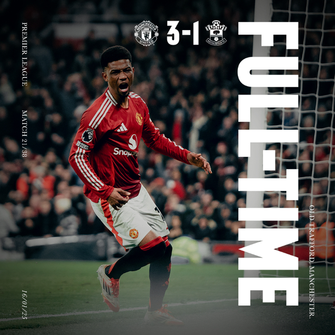 맨유는 17일(한국시간) 영국 맨체스터의 올드 트래포드에서 열린 2024~2025시즌 잉글랜드 프리미어리그(EPL) 21라운드에서 사우스햄튼에 3-1로 이겼다.