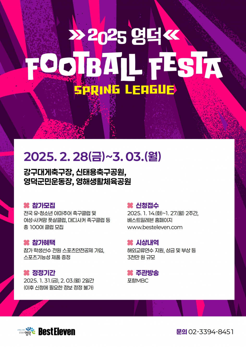 베스트일레븐은 16일 보도자료를 통해 "새봄을 맞아 축구도 즐기고 지역에 머무르며 관광도 즐기는 풋볼 페스타는 초·중등 학생 선수의 학기 말 방학 기간을 이용해 오는 28일부터 나흘간 경북 영덕군 일원에서 개최된다. 참가 신청 접수는 오는 1월 27일까지다"라고 밝혔다.