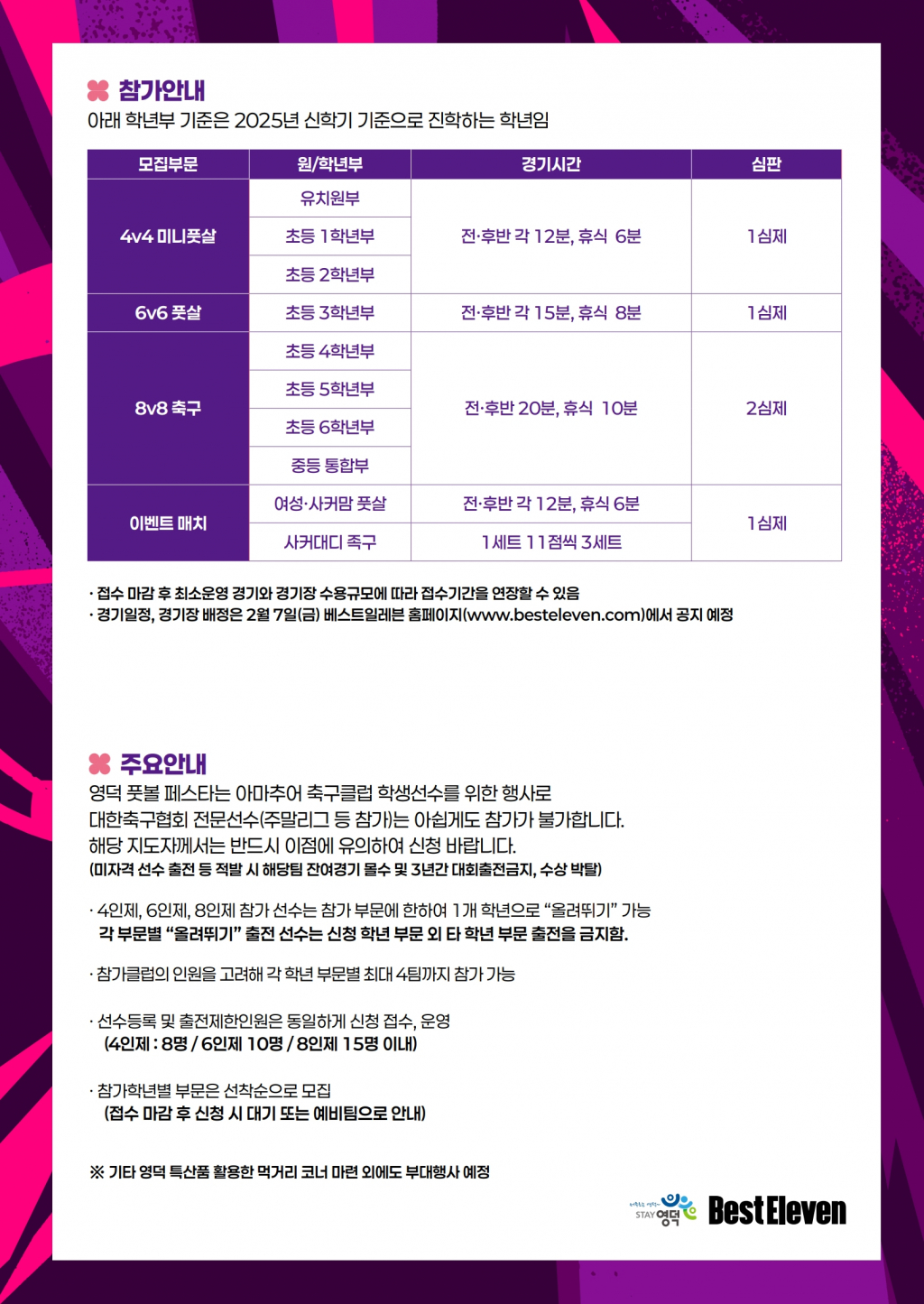 참가 신청은 유치부부터 아마추어 초등 1~6학년부와 중등 통합부 그리고 여성-엄마 풋살, 아빠 족구 등 10개 부문별로 선착순으로 접수하며, 베스트일레븐 홈페이지에서 신청할 수 있다.