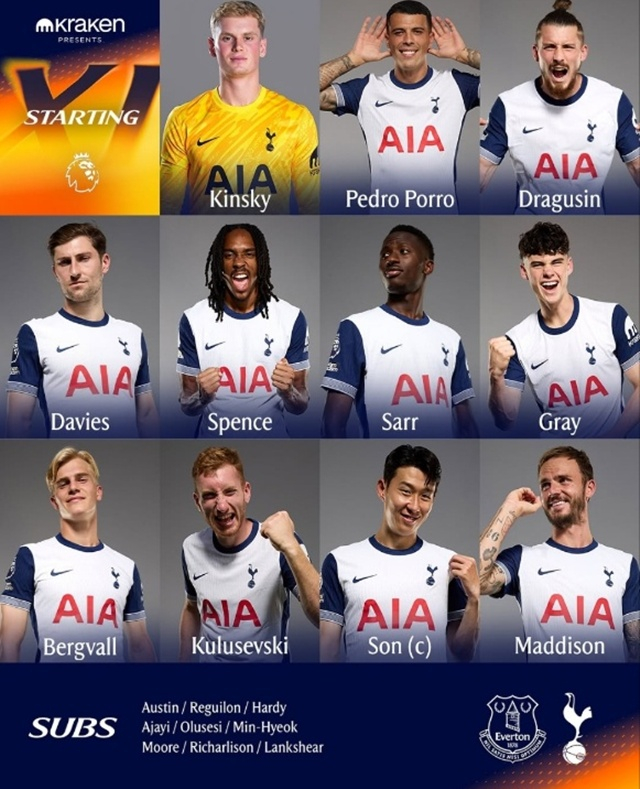 먼저 손흥민은 변함없이 선발 명단에 이름을 올렸다. 제임스 매디슨, 데얀 쿨루셉스키와 공격진을 구성할 것으로 보인다. 또 루카스 베리발, 아치 그레이, 파페 사르, 제드 스펜스, 벤 데이비스, 라두 드라구신, 페드로 포로, 골키퍼 안토닌 킨스키가 선발 출전한다.