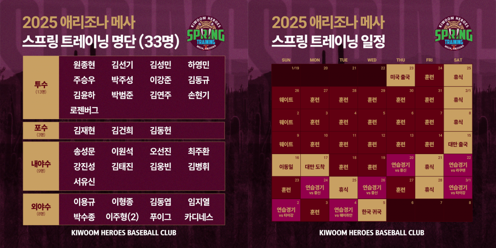 키움 히어로즈는 "오는 23일부터 3월 5일까지 총 42일간 미국 애리조나와 대만 가오슝에서 2025시즌 스프링캠프를 실시한다"고 20일 밝혔다.