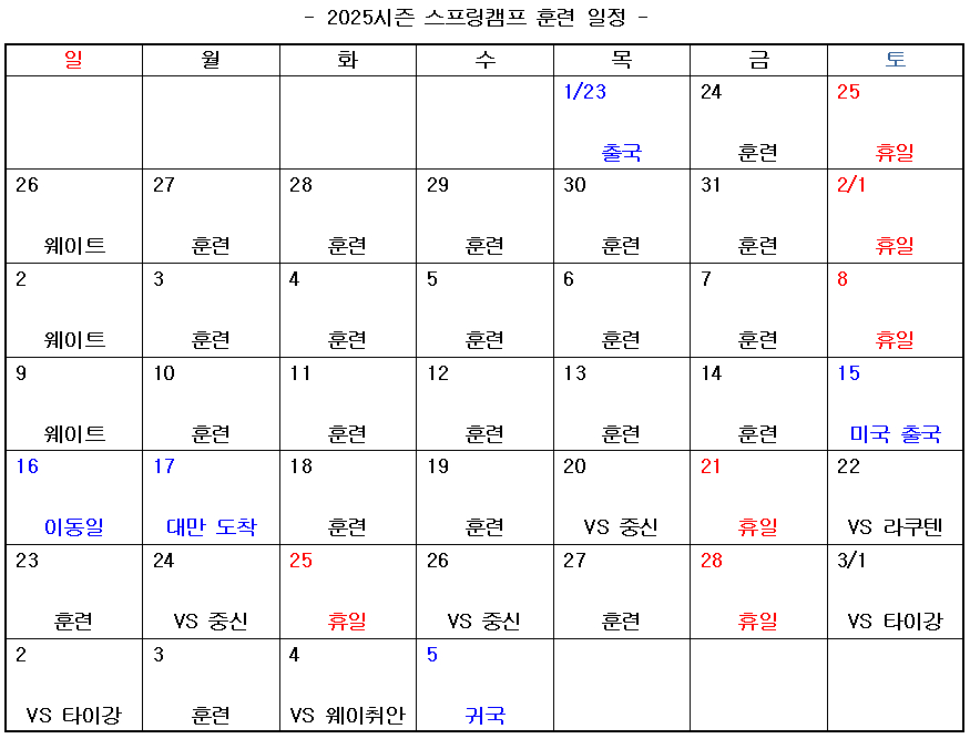 1군 캠프 참가 선수단은 오는 23일 오후 9시 항공편을 이용해 1차 캠프 장소인 미국 애리조나로 출국한다.