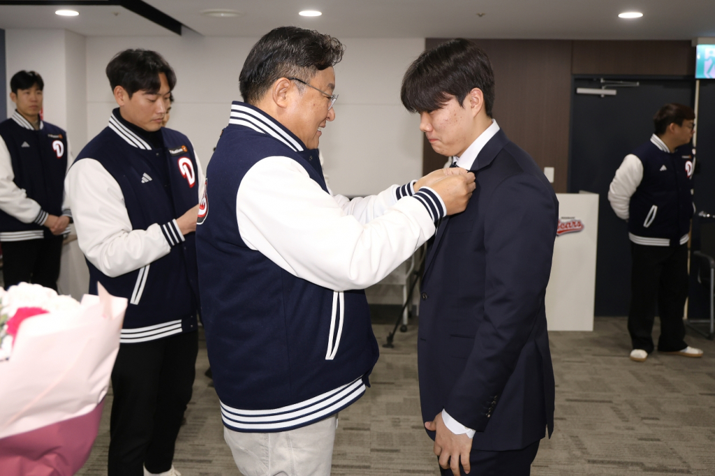 고영섭 두산 베어스 사장은 구단이 제공한 선수단 맞춤 정장에 그룹 배지를 직접 달아주며 '두산인'이 된 신인들을 환영했다.
