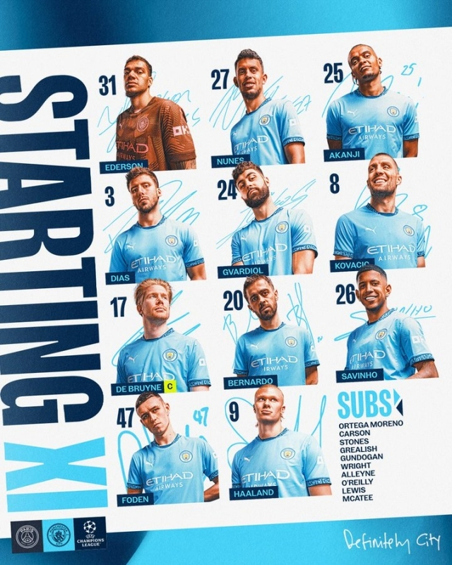 맨시티는 4-1-4-1 포메이션을 가동했다. 최전방 원톱에 엘링 홀란, 2선에 사비뉴, 케빈 데 브라위너, 베르나라두 실바, 필 포덴이 자리했다. 수비형 미드필더로 코바치치가 배치됐다. 포백은 요슈코 그바르디올, 마누엘 아칸지, 후뱅 디아스, 마테우스 누네스가 구성했다. 골키퍼 장갑은 에데르송 모라이스가 꼈다.