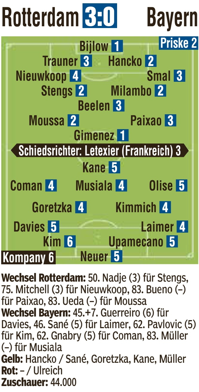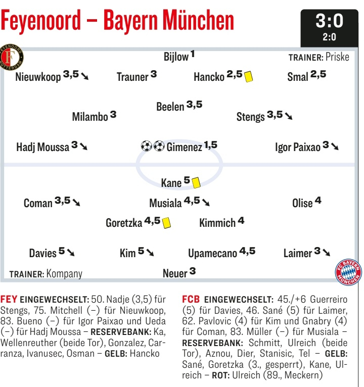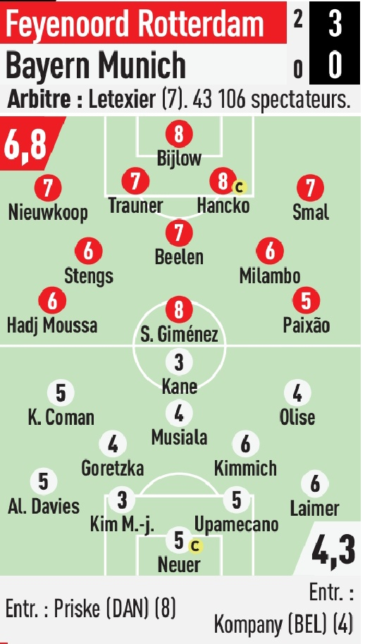 '키커'는 김민재에 평점 5를 줬다. 해당 매체의 평점은 숫자가 높을수록 혹평이다. 페예노르트전 뮌헨에서 5점을 받은 건 김민재와 해리 케인, 알폰소 데이비스였다.
