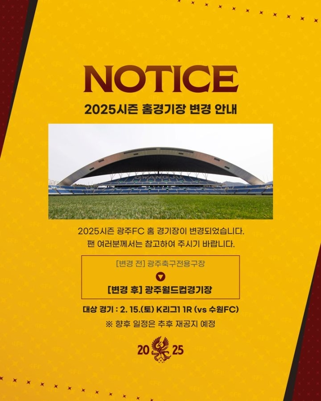 광주는 "다음달 15일 열리는 수원FC와의 '하나은행 K리그1 2025' 홈 개막전 경기를 광주월드컵경기장으로 변경한다"고 24일 발표했다.