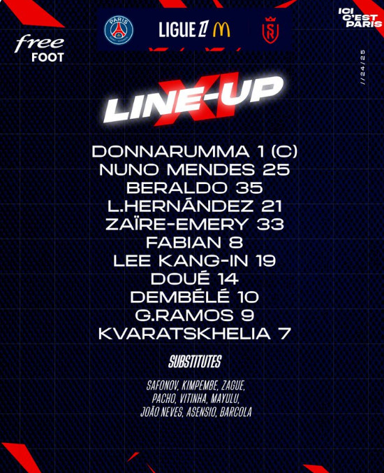 PSG는 4-3-3 포메이션을 가동했다. 최전방 스리톱에 곤살루 하무스, 우스만 뎀벨레, 흐비차 크바라츠 헬레아가 출격했다. 2선에 이강인, 파비안 루이스, 데지레 두에가 배치됐다. 포백은 워렌 자이르 에메리, 루카스 베랄두, 뤼카 에르난데스, 누노 멘데스가 구성했다. 골키퍼 장갑은 잔루이지 돈나룸마가 꼈다.