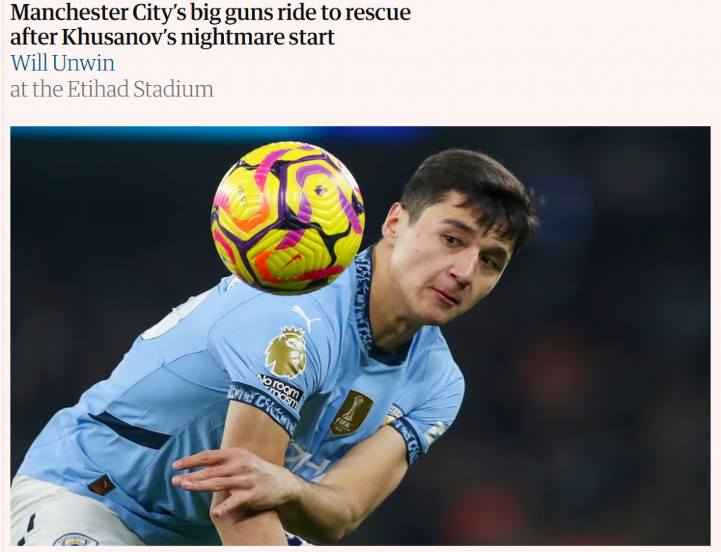 압두코디르 후사노프(21)가 맨체스터 시티 데뷔전 '호러쇼'를 펼쳤다. 펩 과르디올라(54) 감독도 아쉬움을 나타냈다.