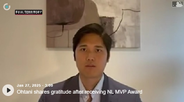 오타니는 만찬에 보낸 영상에서 "올해 시상식 만찬에 참석하지 못해 죄송하다. 최근 로스앤젤레스(LA)에서 발생한 화재가 우리 모두에게 영향을 미쳤기 때문에 우리 가족은 여러 가지 이유로 참석이 어려웠다"고 양해를 구했다.