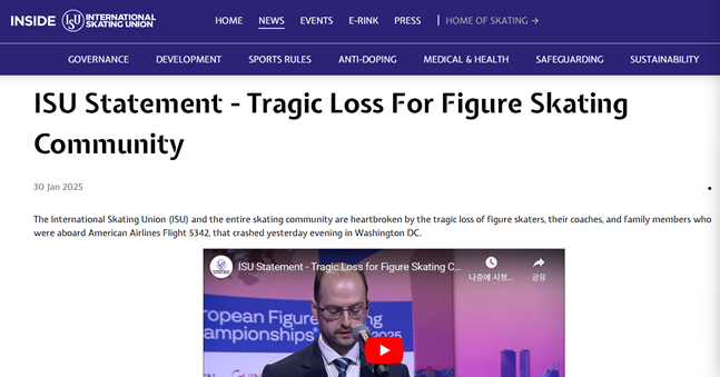 ISU는 30일(현지시간) 공식 홈페이지에 성명을 내고 "ISU와 빙상계는 미국 워싱턴DC에서 추락한 여객기에 탑승한 피겨스케이팅 선수와 코치, 가족의 비극적 희생에 애도를 표한다"며 "우리는 미국 피겨계와 긴밀하게 소통하고, 매우 힘든 시기에 있는 유가족을 전폭적으로 지원할 것"이라고 밝혔다.