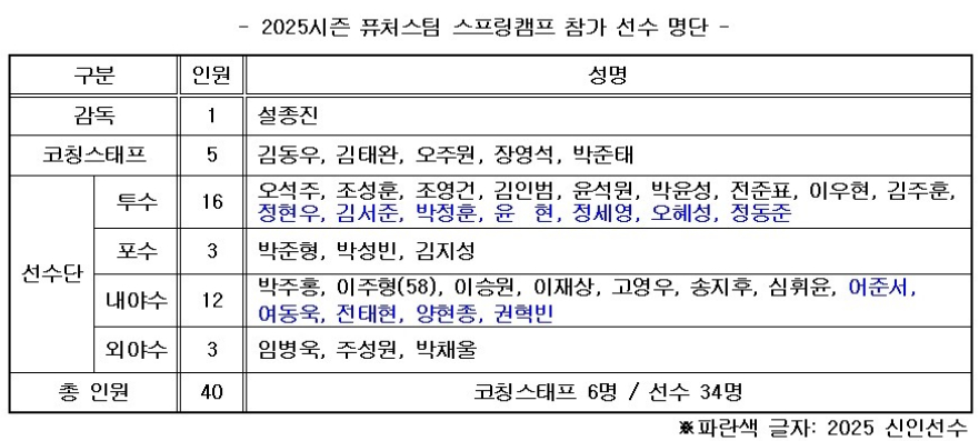 키움은 이번 퓨처스 팀 캠프 참가 명단에 관해 "2025 신인 선수 12명을 비롯해 저연차 선수들을 중심으로 구성했다"고 설명했다.