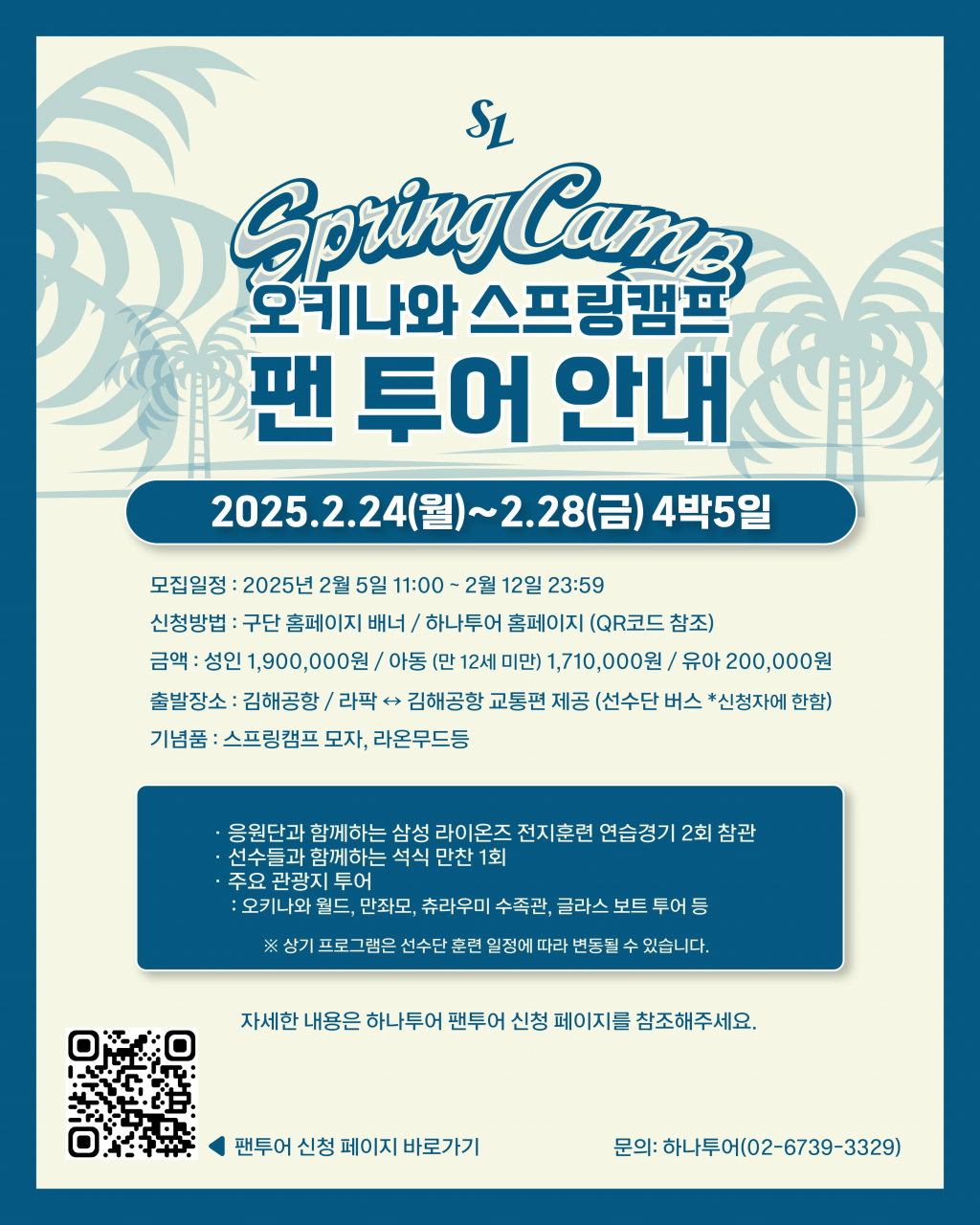 응원단장 및 치어리더와 함께하는 연습경기 관전 2회(25일 SSG전, 27일 KT전), 선수단과 함께하는 특별 저녁 만찬, 오키나와 주요 관광지 투어가 주요 일정이다. 팬 투어 참가자들에게는 기념품으로 2025 스프링캠프 모자, 라온 무드등이 증정된다.