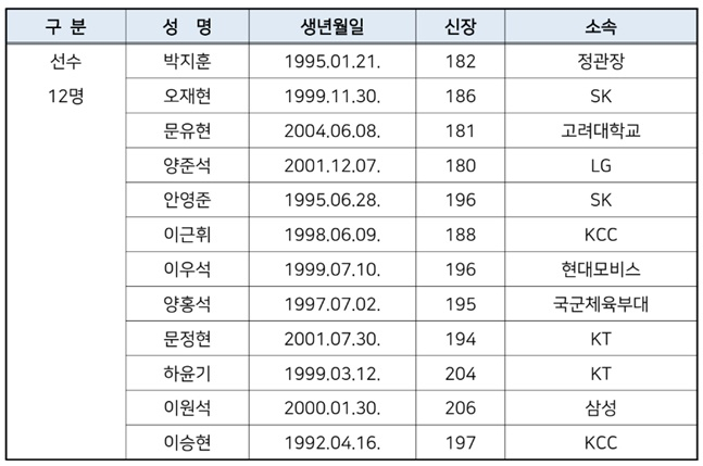 대한민국농구협회(KBA)는 지난 4일, 안준호 감독이 이끄는 2025 FIBA 아시아컵 예선 WINDOW-3 남자농구 국가대표 최종 엔트리 12명을 확정했다.