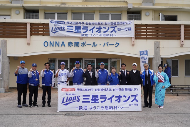 삼성 구단에 따르면 온나손 촌장 및 지역 관계자 등 30여명은 6일 일본 오키나와현 온나손 아카마 구장을 찾았다. 삼성은 지난 2005년부터 온나손 아카마 구장에서 캠프를 치르고 있다.
