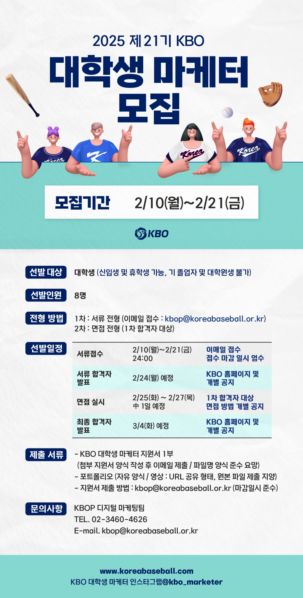 지원서와 포트폴리오는 오는 21일 자정까지 KBOP 이메일로 제출해야 한다. 자세한 내용 및 유의사항은 KBO 공식 홈페이지 및 인스타그램을 통해 확인 가능하다.