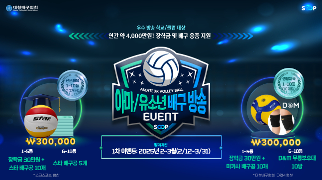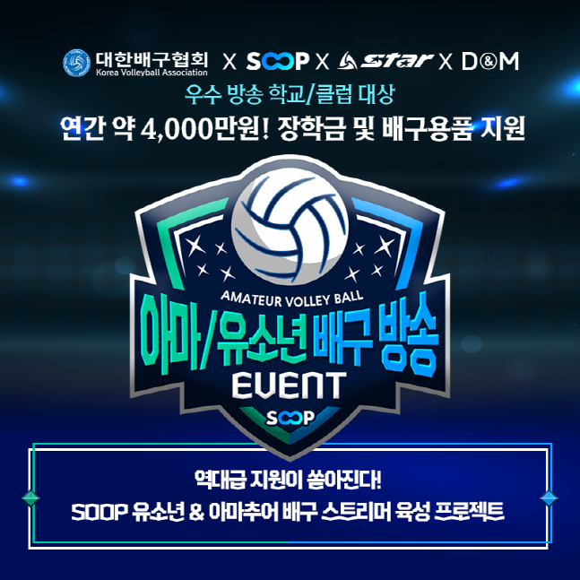 이번 프로그램을 통해 대한배구협회와 SOOP은 우수 방송 학교·클럽을 대상으로 장학금과 배구 용품을 지원할 예정이다. 지원 프로그램은 배구 생방송이 가능한 클럽, 초·중·고, 대학·동호인 누구나 신청 가능하다. 방송은 유소년과 아마추어의 연습·친선·대회 경기 등 다양한 형태가 모두 포함된다.