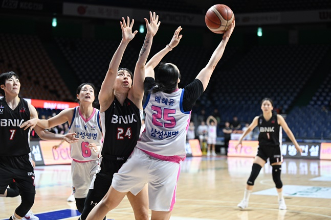 BNK는 배혜윤이 볼을 잡으면 더블팀을 붙는 등 집중견제에 나섰다. 치열한 몸싸움 과정에서 '유혈사태'도 일어났다. 삼성생명이 58-56으로 앞서던, 4쿼터 3분 7초가 남은 상황. 배혜윤은 상대 수비를 뚫어내면서 파울을 얻어냈다. 그런데 자유투를 쏘려던 배혜윤을 심판이 막았다. 왼손에서 피가 났기 때문이다. 벤치에서 급하게 지혈 후 돌아온 그는 자유투 2개를 모두 성공시키며 4점 차를 만들었다.