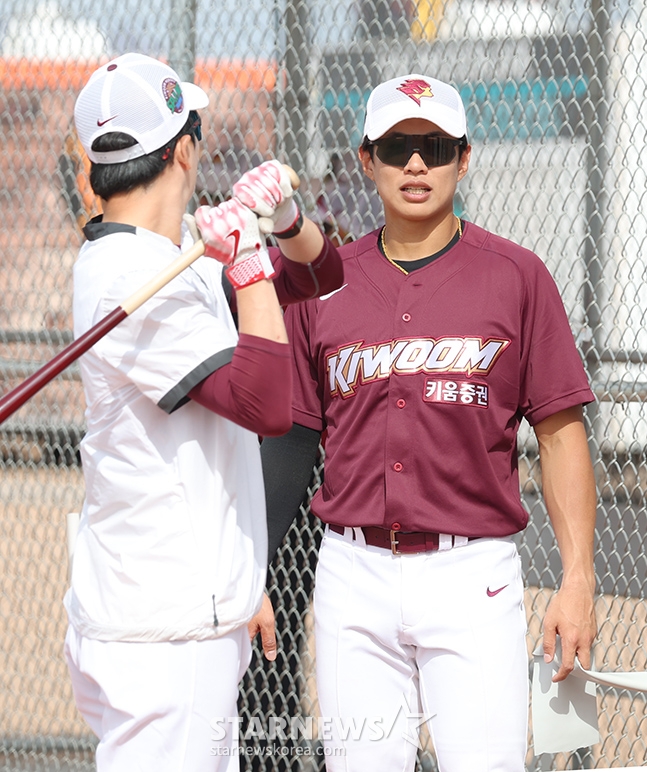 주장 송성문이 대화를 나누며 훈련을 하고 있다.
