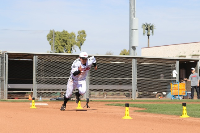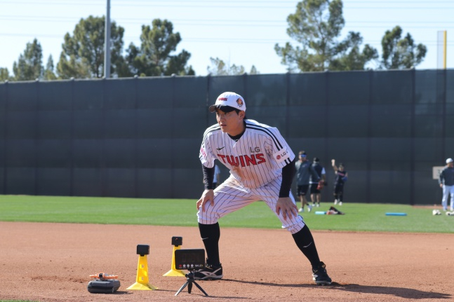 LG 선수들은 최근 미국 애리조나주 스코츠데일 인디언스쿨파크 야구장에서 열리는 2025 스프링캠프에서 색다른 주루 훈련을 시도하고 있다.
