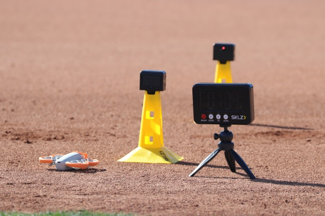 노란색의 스피드 센서와 그 옆의 타임 체크기(검정색 초시계)는 선수들의 스피드를 확인해주는 장비다. 정수성 코치는 "도루에서 첫 스타트에서 3~5발까지가 가장 중요하고, 도루를 성공할 수 있는 포인트 구간이기 때문에 어떤 선수가 제일 빠른지 기준을 세울 수 있어서 쓰고 있다"며 "타임 체크기를 통해 실시간으로 시간을 잰다. 선수들이 뛰고 나서 바로 자기 기록을 실시간으로 보면서 훈련하니까 훈련 효율성이 커진다"고 말했다.