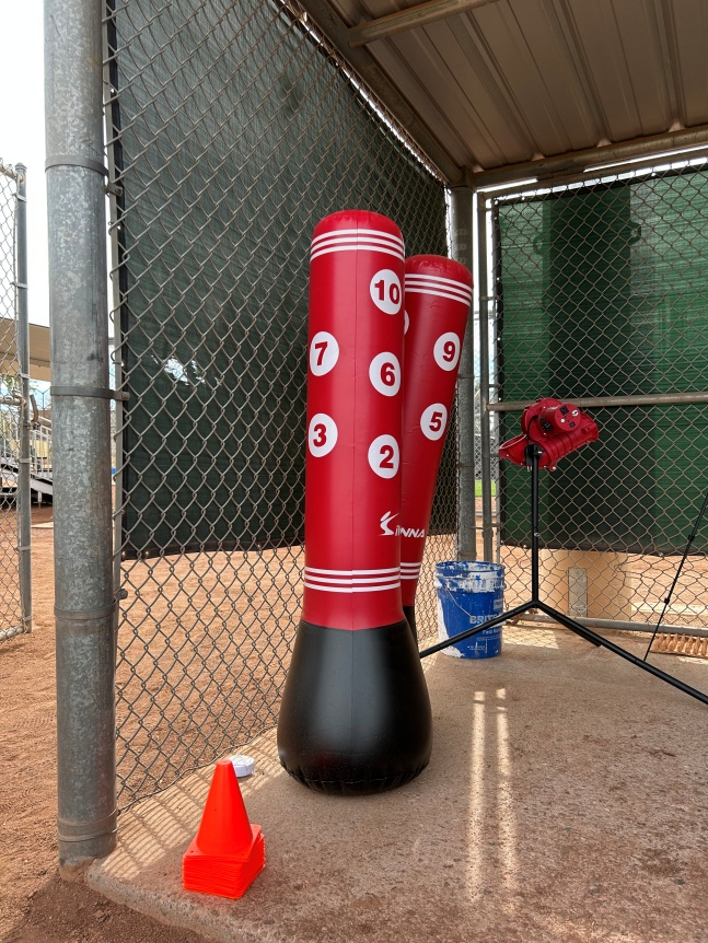 베이스 옆에 세워진 빨간색의 오뚜기 모형은 선수들이 베이스에서 턴할 때 따로 말하지 않아도 부딪히지 않게 훈련을 돕는다.