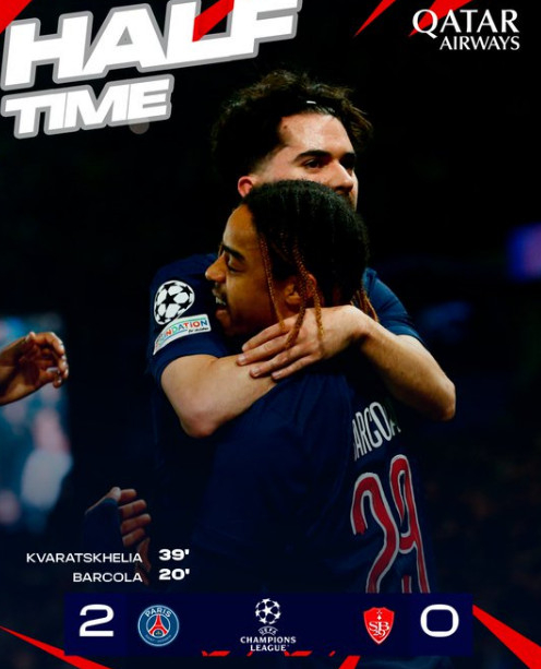몰아붙인 PSG가 추가골을 터트렸다. 전반 39분 네베스가 오른쪽 측면에서 올린 땅볼 크로스가 바르콜라의 발에 스친 뒤 크바라츠헬리아에게 흘렀다. 크바라츠헬리아가 박스 깊숙한 지역 각이 없는 상황에서 차 넣어 마무리했다.