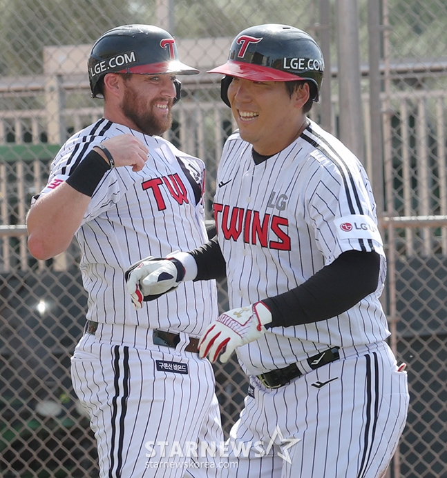 [포토] 김현수 '오스틴의 시샘 눈빛 좋아'