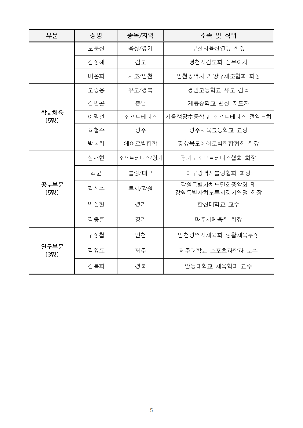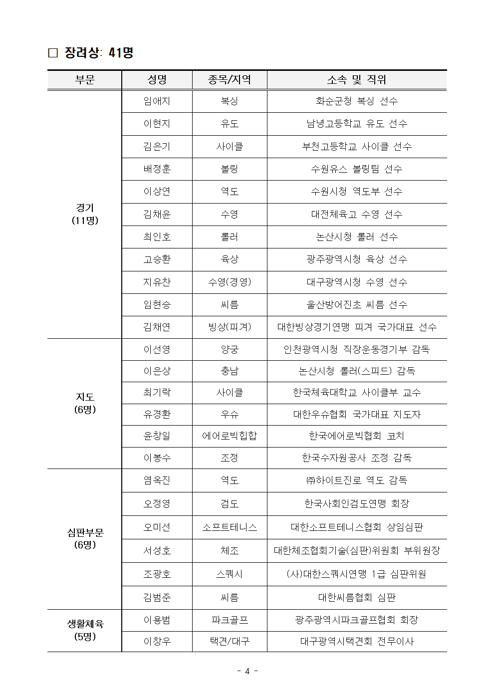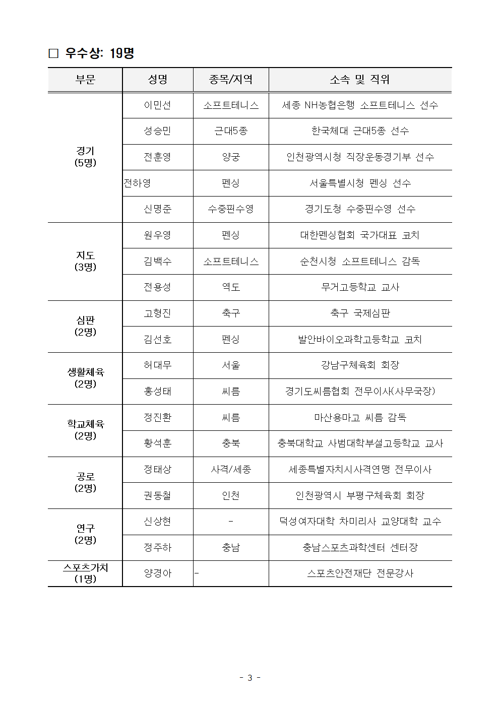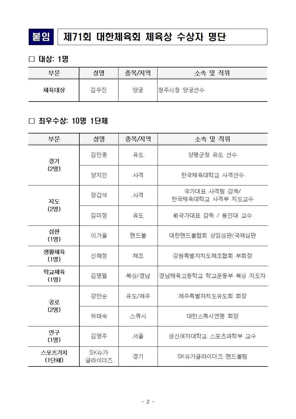대한체육회 체육상 수상자에는 경기, 지도, 심판, 생활체육, 학교체육, 공로, 연구, 스포츠가치 총 8개 부문에서 71명과 1개 단체가 선정됐다.