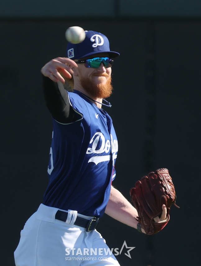 다저스 투수 메이가 캐치볼 훈련을 하고 있다.