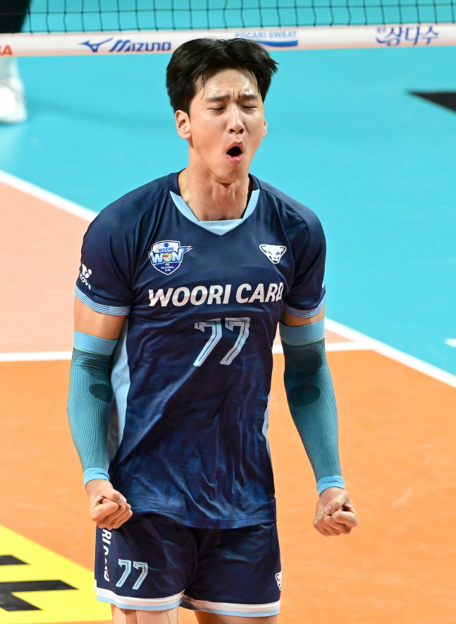 그러나 마지막에 웃은 건 우리카드였다. 알리의 퀵오픈에 이어 박진우가 레오의 백어택을 블로킹으로 잡아내 1세트를 가져왔다.