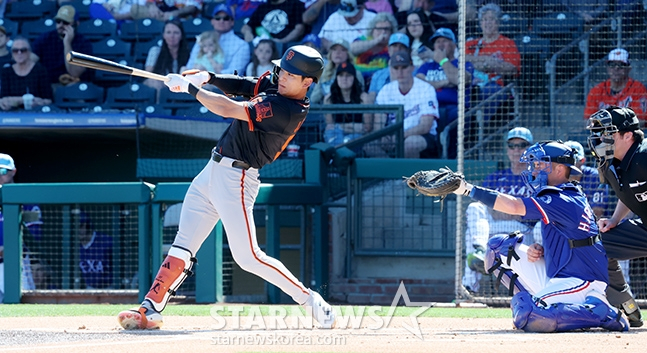 이정후는 23일(한국시간) 미국 애리조나주 서프라이즈의 서프라이즈 스타디움에서 열리는 텍사스 레인저스와 2025 메이저리그(ML) 시범경기 개막전에서 3번 타자 및 중견수로 선발 출전해 1회 첫 타석부터 우전 안타를 터트렸다. 하지만 이후 타석에서는 삼진, 1루 땅볼 아웃으로 각각 물러나며 아쉬움을 삼켰다.