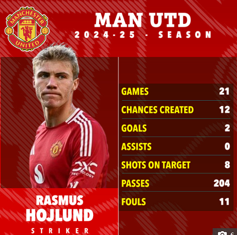 하지만 호일룬은 맨유의 기대를 완전히 저버렸다. 2024~2025시즌에서도 잉글랜드 프리미어리그(EPL) 21경기에 나서 2골밖에 기록하지 못했다.