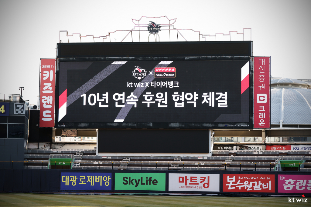 2016년 첫 후원 협약 이후 10년째 파트너로 함께하고 있는 KT와 타이어뱅크는 매년 프로야구 발전과 흥행을 위해 다양한 공동 마케팅을 진행하고 있다. 2021년 통합 우승과 지난해 5년 연속 포스트 시즌 진출의 영광도 함께했다.